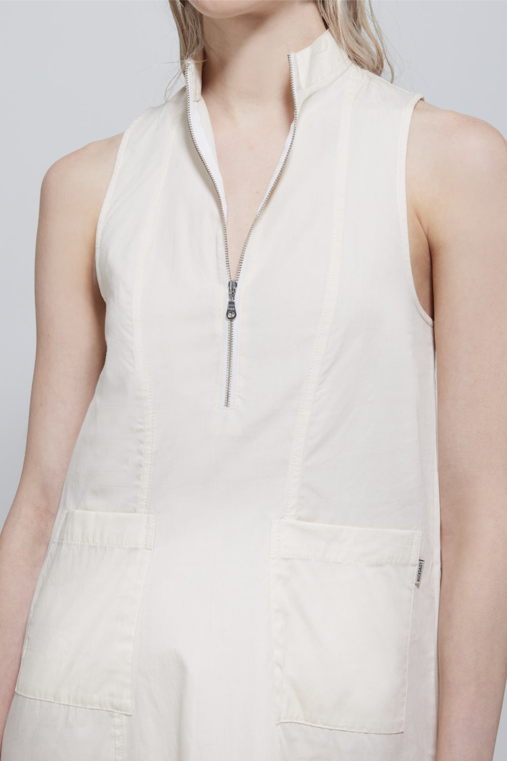 The Amelie Sleeveless Zipped Dress in black is a unique piece that combines strength and femininity with a touch of underground vibes. It was crafted by draping the fabric directly on a mannequin, resulting in hidden darts on the neck, bust, and princess lines. These details are accentuated by stylish topstitching and front patch pockets. Made from lightweight TENCELâ„¢ poplin, this dress offers a tailored fit that isn't too snug on the body. Plus, the exposed YKK zipper with a doughnut puller adds a bold attitude to the design.