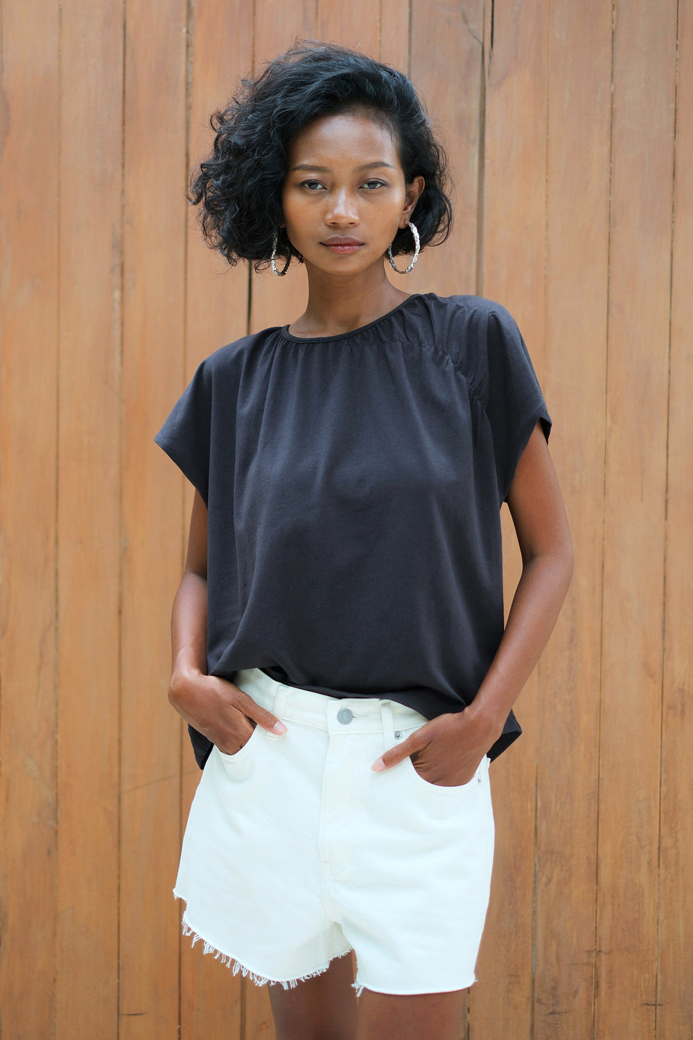 Say goodbye to boring T-shirts: ELENA amps it up with an asymmetrical front ruching pattern and oodles of style on the back. A timeless classic for your closet- must-haves!